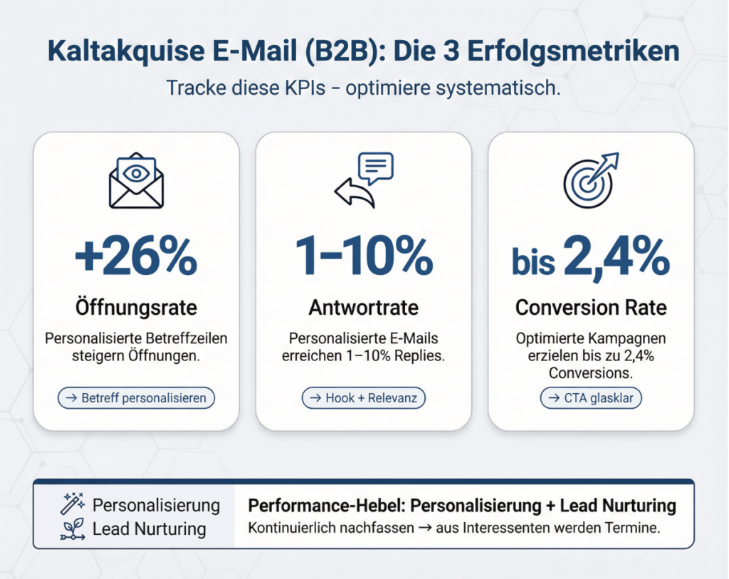 Das individuelle Anpassen von Kaltakquise-E-Mails erhöht die Antwortraten erheblich, und die Verwendung von Erfolgsmetriken wie Öffnungsrate, Antwortrate und Conversion Rate hilft, den Erfolg der Kampagnen zu messen und zu steigern.