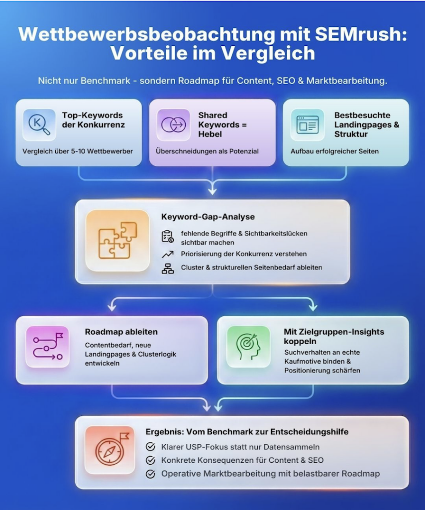 So wird aus einem reinen Benchmark eine strategische Entscheidungshilfe. Kein Sammeln von Daten, sondern klare Ableitung deines USP – mit konkreten Konsequenzen für Content, SEO und Marktbearbeitung.