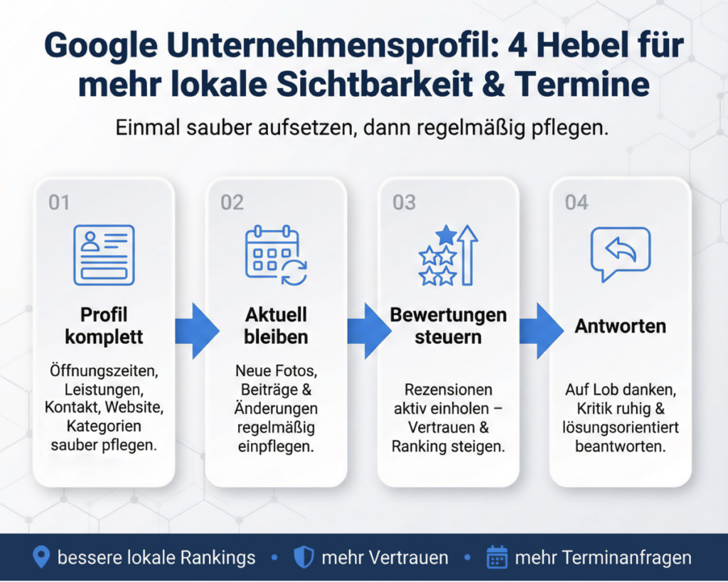Eine gezielte lokale Optimierung und ein aktuelles Google My Business-Profil verbessern deine regionale Auffindbarkeit, was die Wahrscheinlichkeit erhöht, dass Patienten in deiner Nähe Termine buchen.