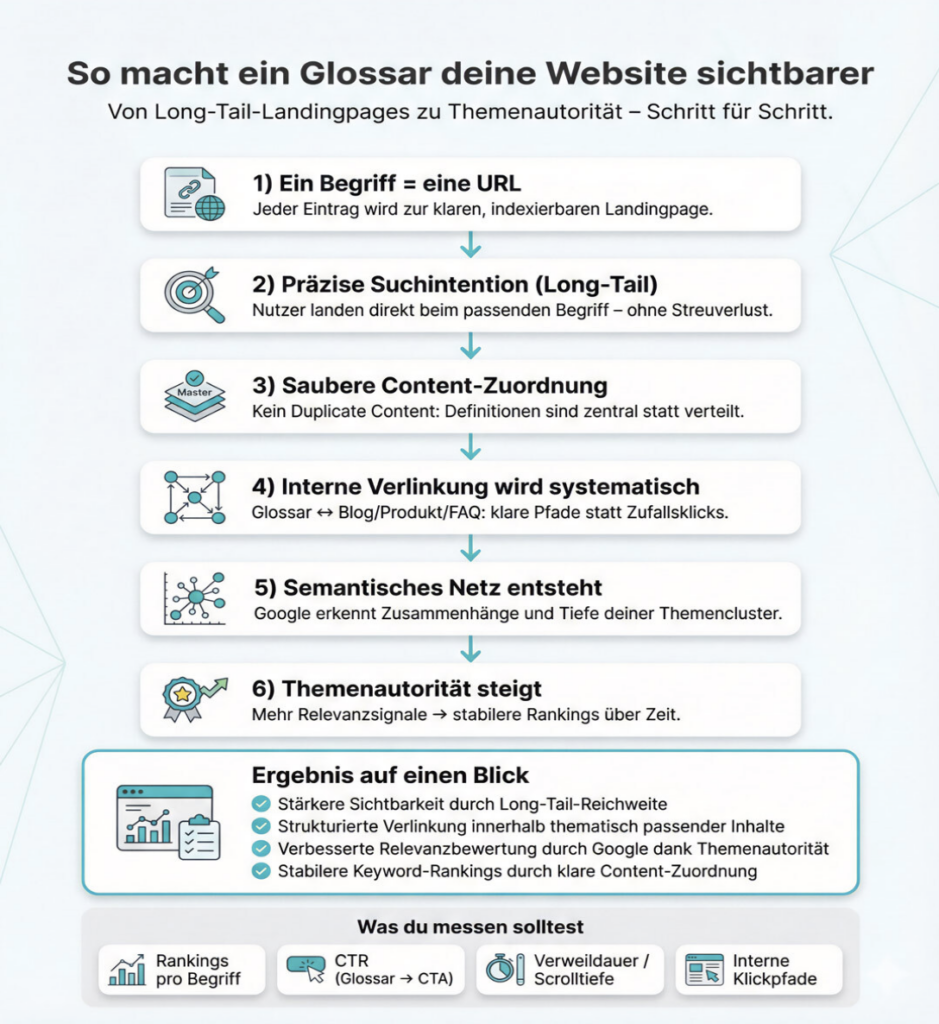 - Ein Glossar stärkt SEO und thematische Sichtbarkeit: Glossarseiten fungieren als eigenständige Landingpages, verbessern die interne Verlinkung und erhöhen durch semantische Struktur die Themenautorität – besonders im Long-Tail-Suchverhalten.